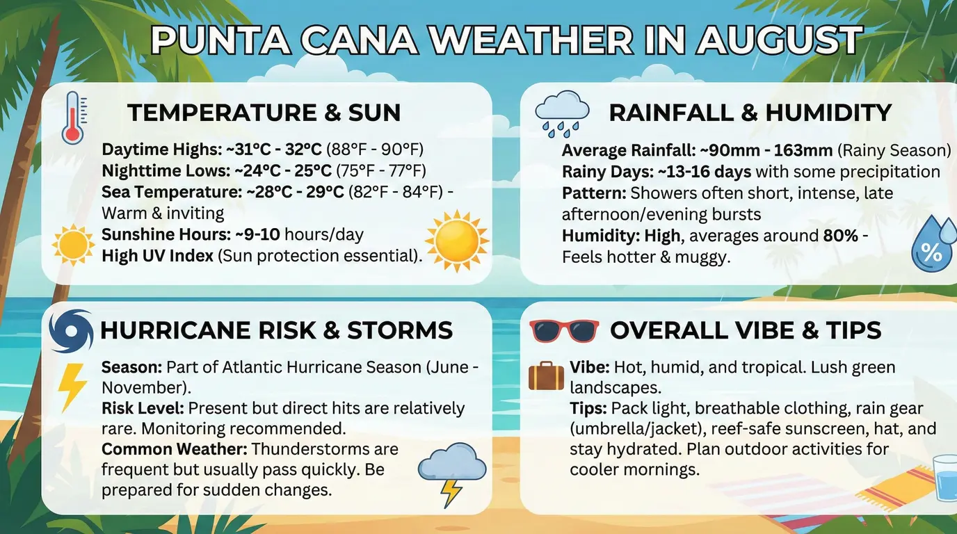 When you plan around the Punta Cana weather in August, you need to pack for heat and potential brief rain.